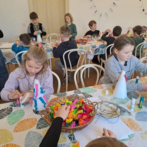 Třída II. stupně (písková) – stoly se sklopenými židlemi, připravené na odpolední úklid.