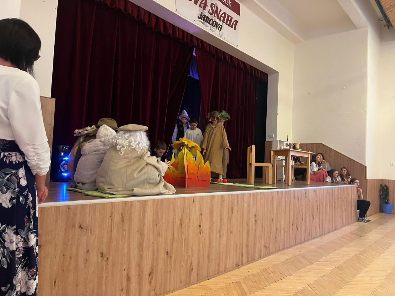 Třída I. stupně (meruňková) – zimní výzdoba, pohodlný čtecí koutek a úložné skříně.